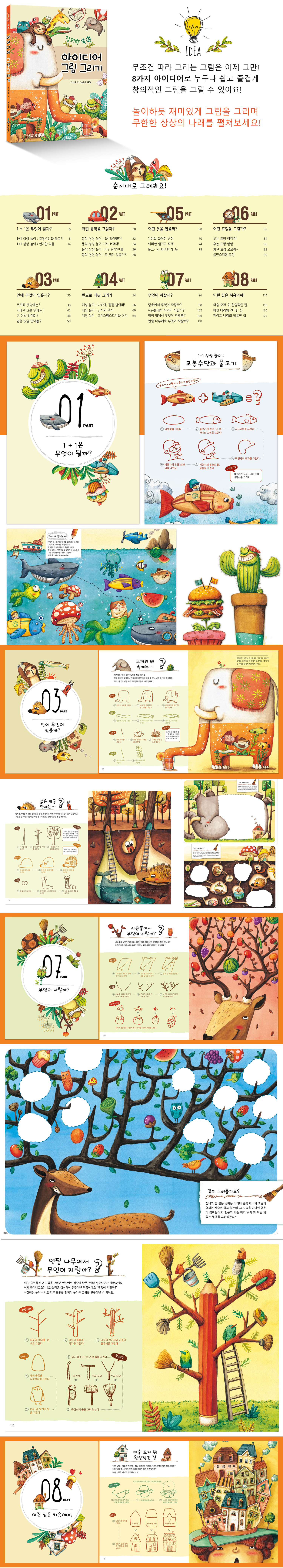 ‘1 + 1’, ‘대칭적 표현’, ‘동작 상상’, ‘어떤 표정을 그릴까?’, ‘이런 집은 처음이야’ 등 창의력을 발휘하는 참신한 8가지 방법이 자연스럽게 아이들에게 전달 됩니다. 그림을 좋아하지만 어디서부터 시작해야 할지 모르는 독자들에게 이 책은 창작의 밑바탕을 튼튼히 다져줄 것입니다. 그림을 자유롭게 그리는 것은 분명 큰 행복입니다. 나만의 독특한 스타일로 가득 찬 ‘아이디어 그림 그리기’, 지금 바로 그 무한한 상상의 나래를 펼쳐보세요!